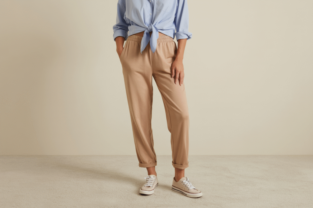 Dress up yoga pants with a crisp button-up shirt tucked in slightly at the front. Pair with sneakers or casual loafers for a smart-casual vibe that’s perfect for work-from-home or casual outings.