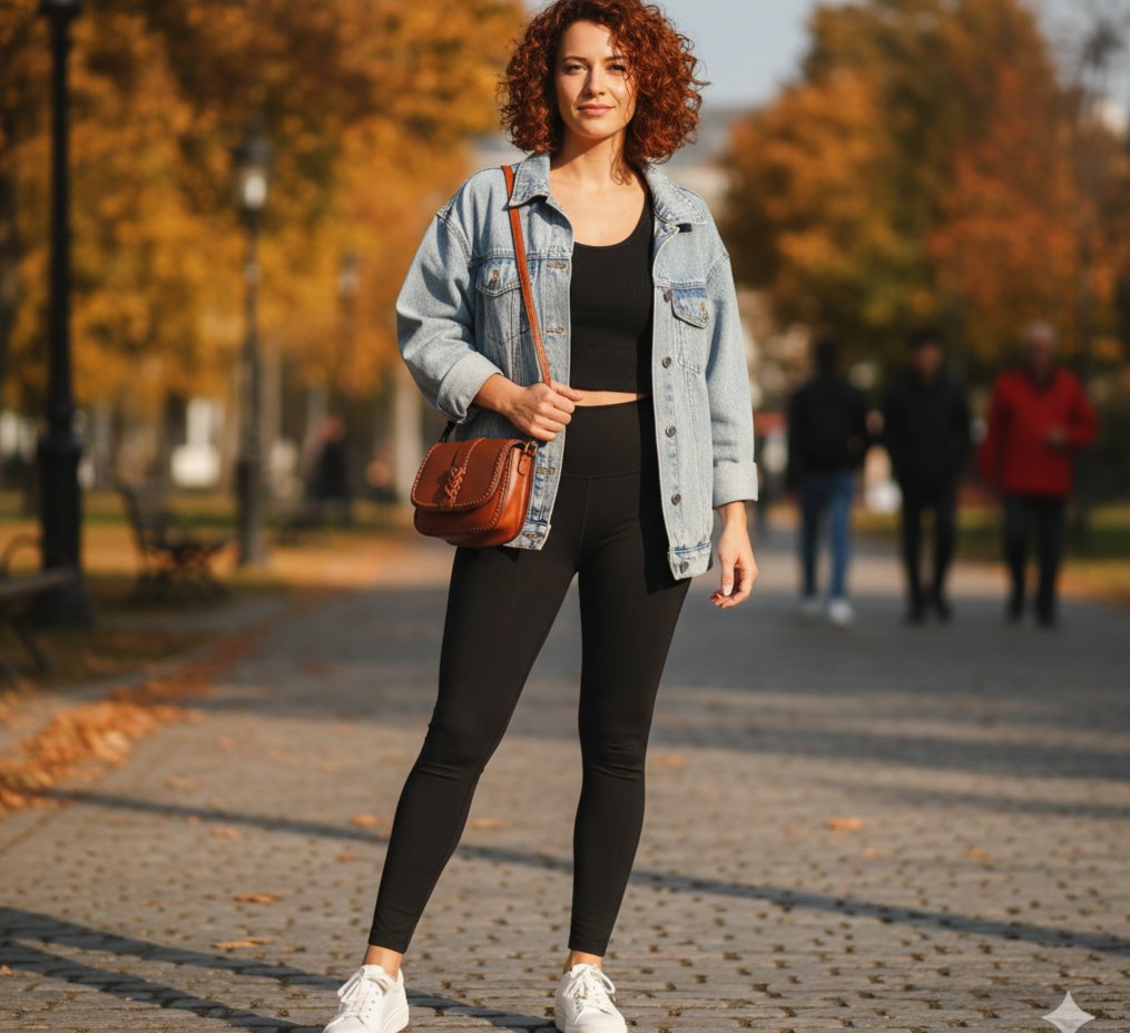 Throw a denim jacket over a fitted tank and yoga pants for a casual, yet stylish layered look. This is perfect for cooler weather or adding a touch of structure to a relaxed outfit.