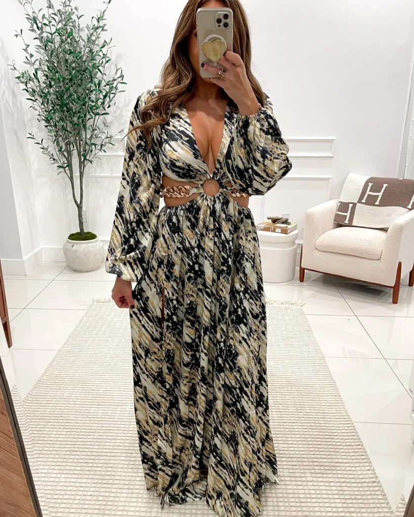 This printed maxi dress brings a bold mix of elegance and baddie energy, making it a standout choice for nights that call for something dramatic. A deep neckline draws the eye, while the ring cutout and gold chain accents at the waist add a striking touch that shapes the silhouette beautifully.
