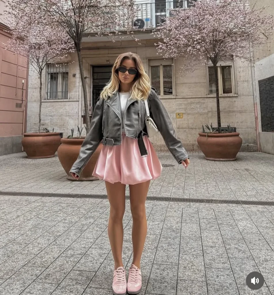 This look brings a soft yet bold energy with its mix of pastel pink and sleek grey leather. The mini skirt adds a fun, flirty vibe that moves beautifully with each step, while the cropped jacket gives the outfit a cool edge.