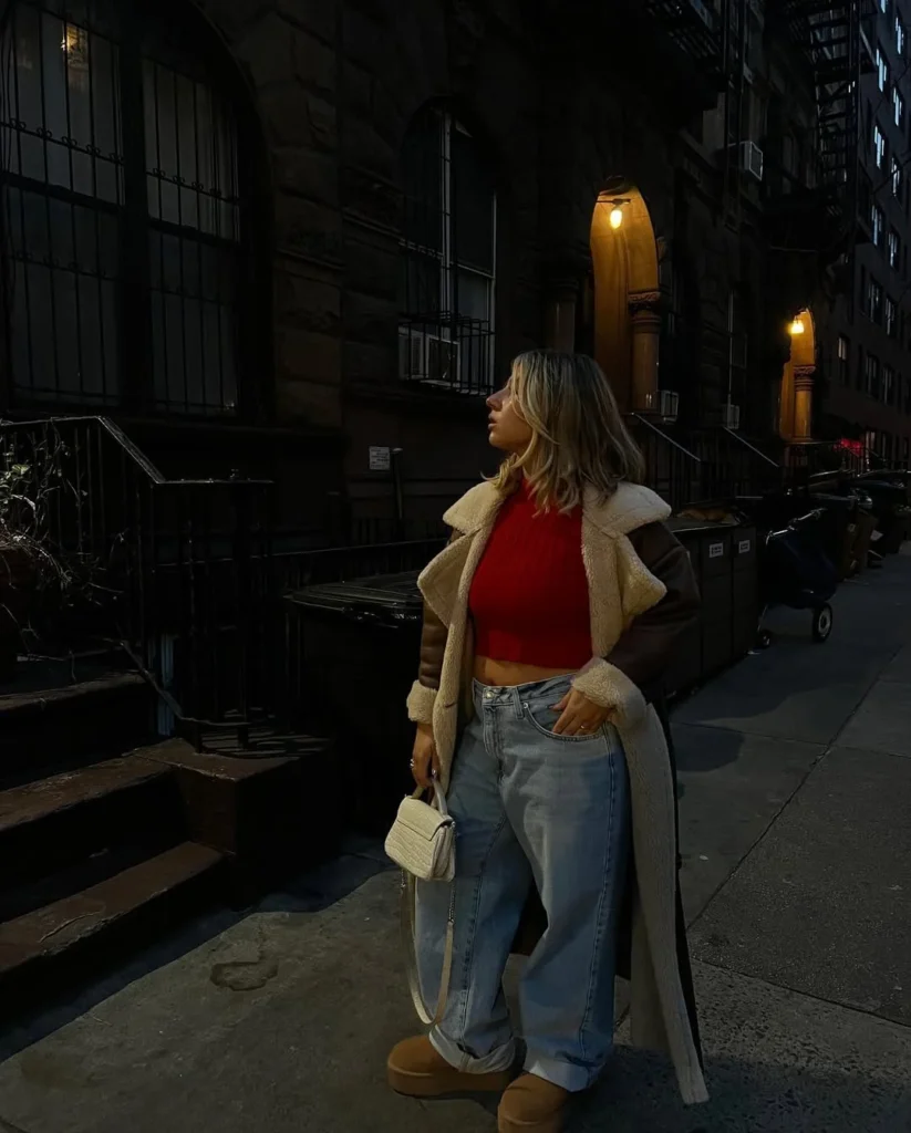 This cozy street-baddie look blends warmth and attitude through an oversized shearling coat layered over a bright red crop sweater. The bold pop of red brings life to the outfit, giving it a confident edge that stands out even on a cold night.