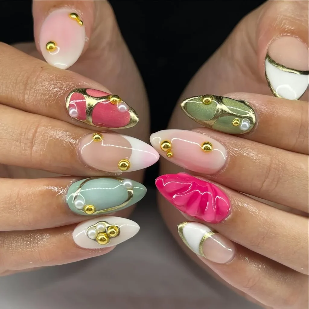 These nails make a bold statement with their mix of vibrant colors and unique designs. Soft pink, green, and white colors are paired with metallic gold accents, creating an eye-catching look.