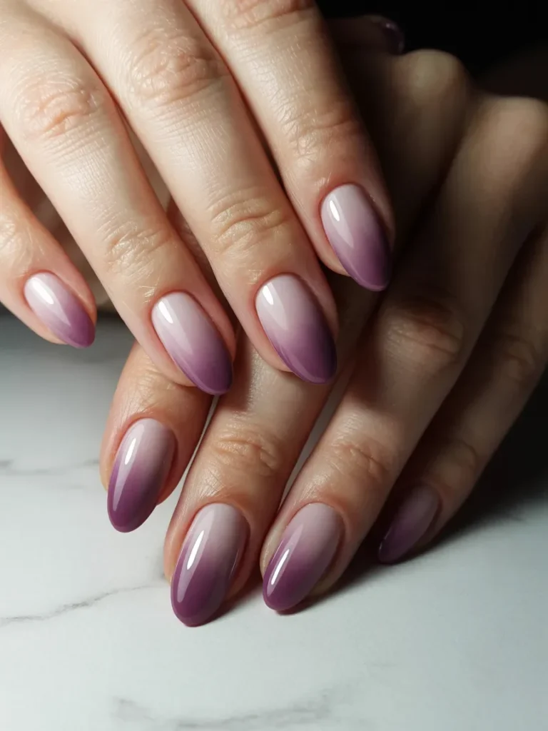 This ombre effect on nails blends purple shades from dark to light, creating an elegant and stylish look. The gradient transitions smoothly, providing a refined appearance while maintaining a fun and edgy feel.