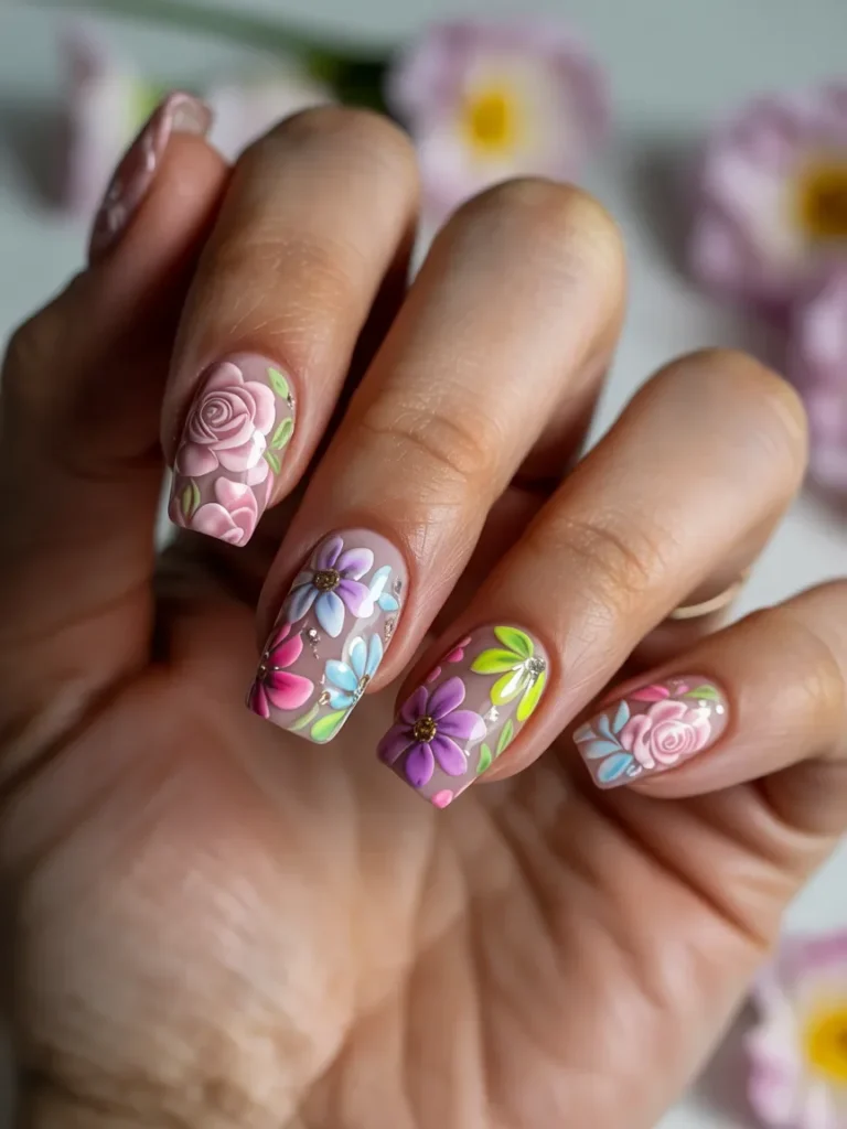 This nail design is a floral masterpiece, with a lovely combination of soft pink, lavender, and green tones. Each nail features delicate hand-painted flowers, adding an artistic and feminine touch.
