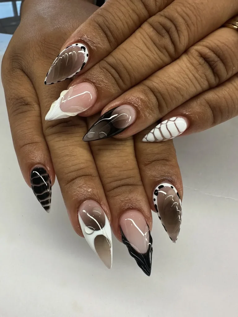 The sharp stiletto shape adds an edgy vibe, making the nails stand out. Bold black and white swirls intermix with smooth gradient transitions for an eye-catching effect.