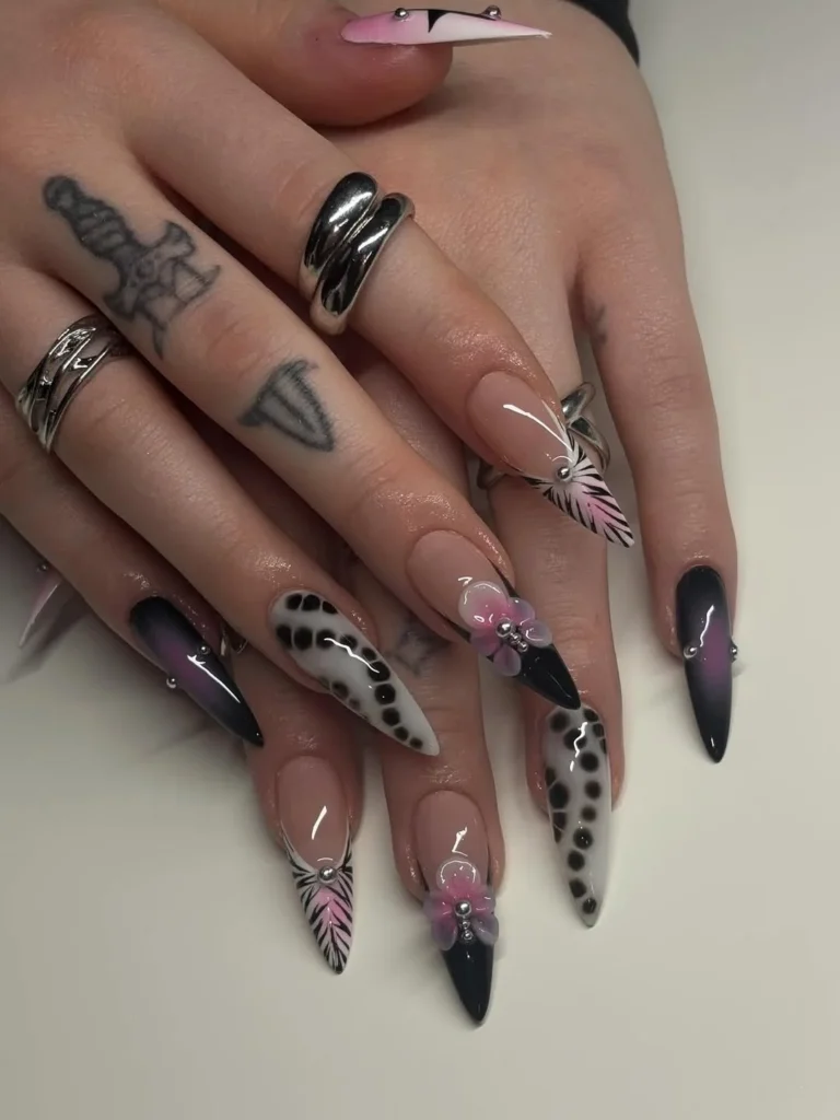 These bold nails feature a striking blend of black, white, and pink tones, each finger showcasing a unique design. From fierce pointed tips to delicate floral accents, these nails are a true work of art.