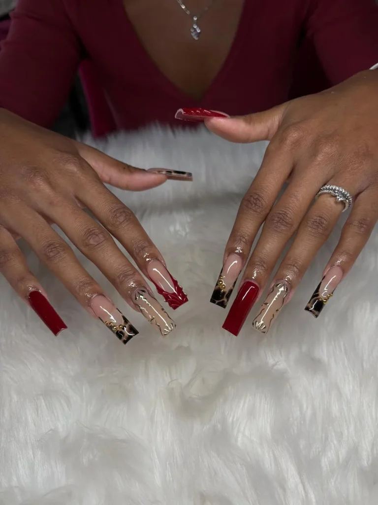 Perfect for any fashion-forward individual looking to add some attitude to their look. The mix of red, nude, and black with a hint of gold is a modern take on the classic baddie nail style.