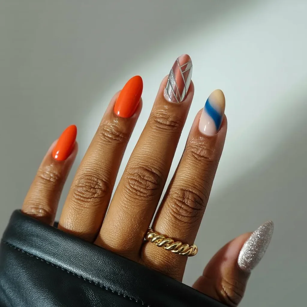 The use of different textures and shapes, like the glossy orange and sparkling silver, gives this set a multi-dimensional feel. Whether for a night out or a chic casual look, these nails make a statement without being too overwhelming.