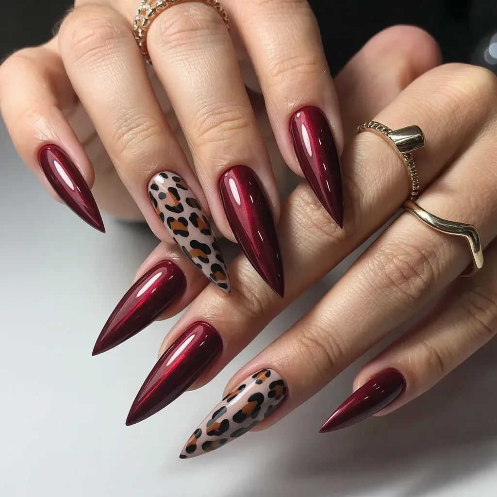 These nails blend bold burgundy with a playful pop of leopard print. The deep red hue is sleek and glossy, giving a striking, polished appearance.