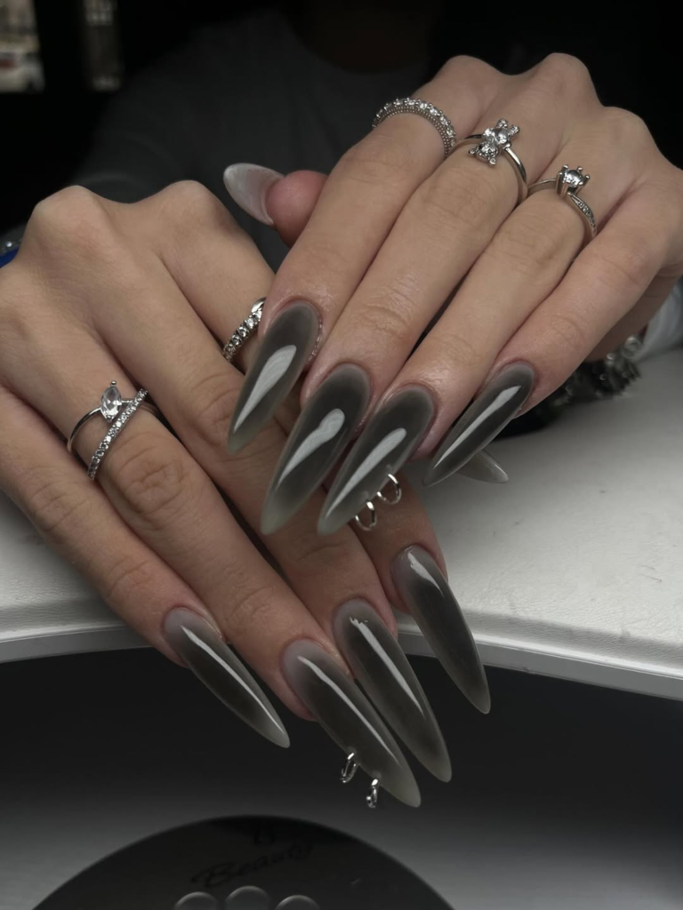 These sleek ombre baddie nails seamlessly blend smoky grays and whites. The sharp, stiletto shape adds a fierce touch, perfect for making a statement.