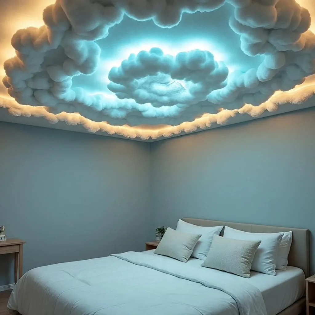 The unique blend of textures and lighting allows the ceiling to serve as both a design element and a functional light source. The soft, cloud-like material enhances the dreamlike quality, making it feel like you’re sleeping under the sky itself. This idea is perfect for transforming any room into a tranquil, relaxing retreat.