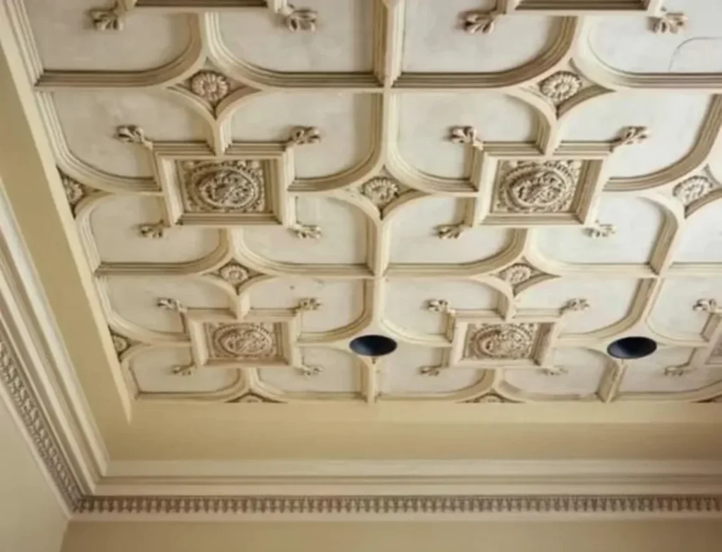 This ceiling design showcases intricate molding with geometric patterns, exuding an elegant, classical aesthetic. The combination of square and circular shapes, along with the fine detailing, creates a sense of structure and harmony. The subtle beige and cream tones of the design give it a timeless feel, making it a suitable choice for both traditional and modern spaces.