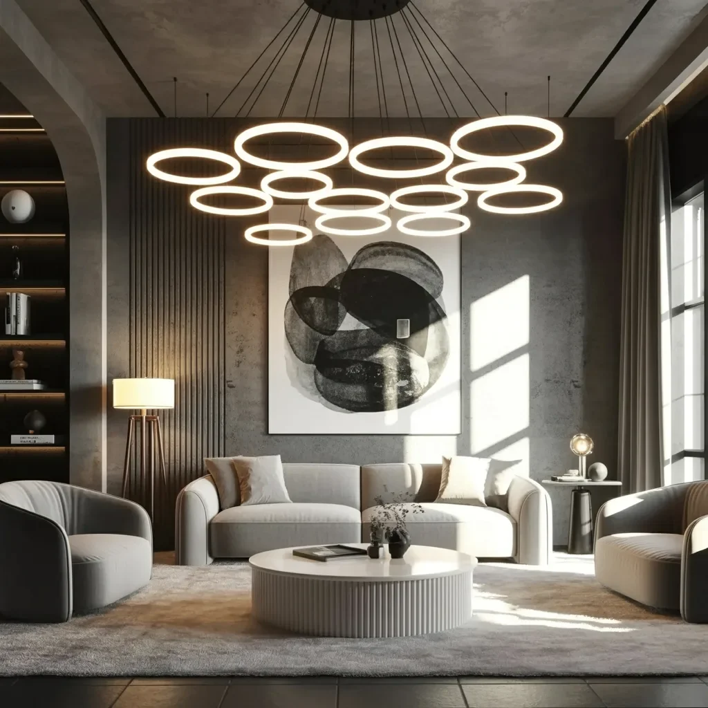 The surrounding neutral tones of the room, from the gray walls to the soft beige furniture, provide a perfect backdrop for this striking light installation. This design works wonderfully in living rooms or lounges where a bold, modern statement is desired.