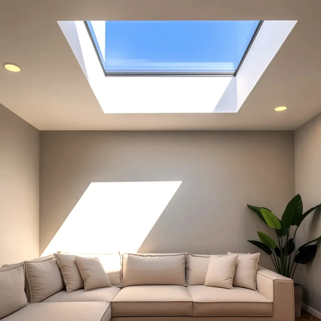 The sunlight contrasts beautifully with the neutral tones of the walls and sofa, adding a touch of brightness. This design works wonderfully in living rooms, where daylight can enhance the overall mood. The simple and unobtrusive light fixtures along the ceiling further emphasize the natural beauty of the skylight.