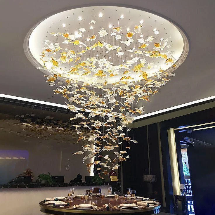 This ceiling design is a striking display of suspended, delicate leaves in shades of white and gold. The leaves, hanging from fine threads, appear to float gently downward, creating an enchanting, organic effect. The circular light fixture surrounding the arrangement provides a soft, radiant glow that highlights the intricate details of each leaf.