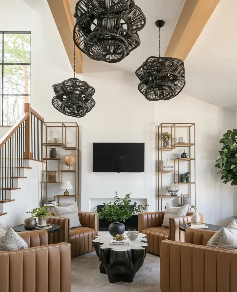 This hanging chandelier design works wonderfully in contemporary settings, particularly in living rooms or dining areas. It blends form and function, illuminating the space while adding an artistic flair. This piece is more than just a light; it’s a statement of modern design.