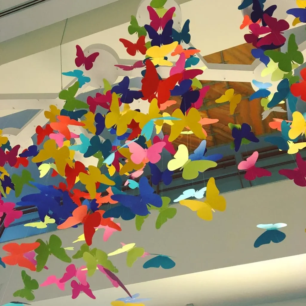 This ceiling design brings an element of fun and whimsy with a colorful butterfly installation. A variety of bright, vibrant butterflies in every shade imaginable seem to float gracefully overhead, adding a playful touch to the room. The butterflies are suspended from delicate threads, creating a dynamic visual effect that feels alive and ever-changing.