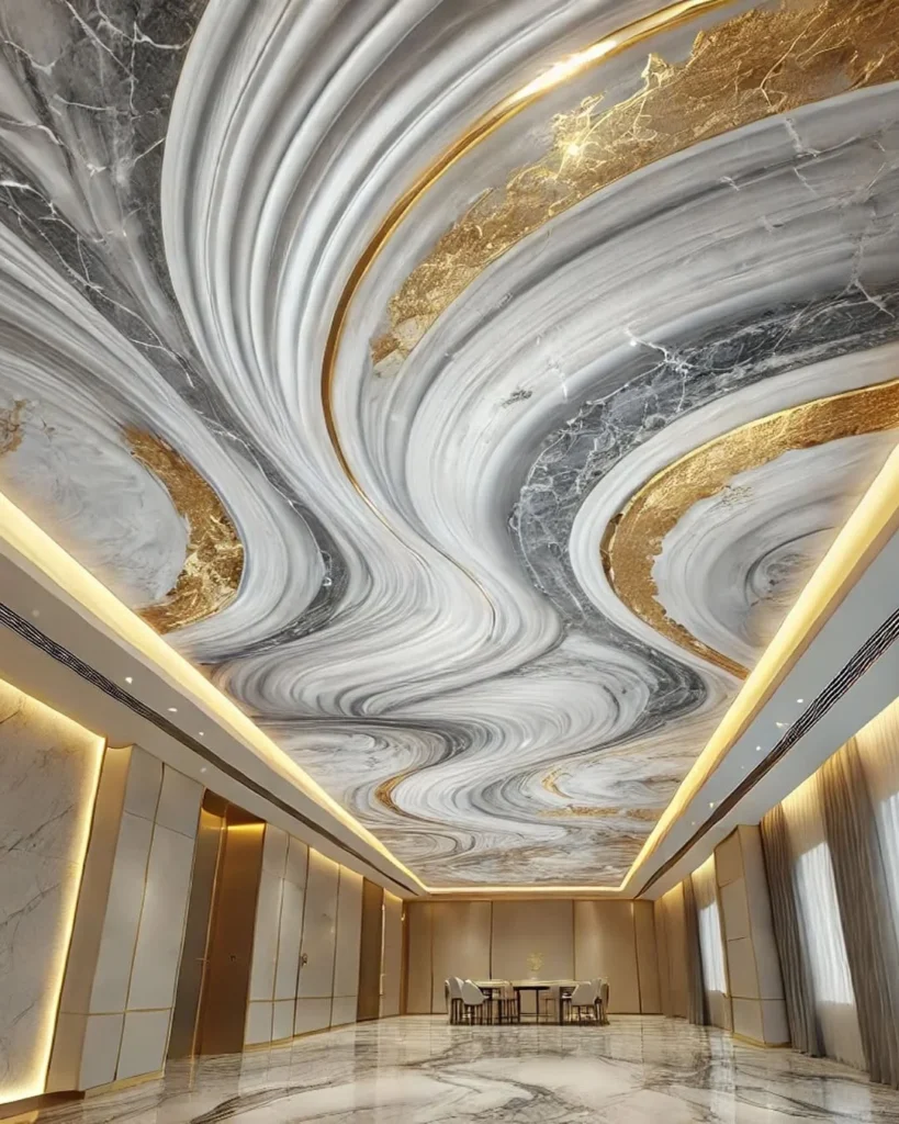 This ceiling design features an elegant marble swirl pattern that flows gracefully across the space. The blend of soft grays and whites creates a sense of movement, while the gold accents strategically placed along the curves add a luxurious touch. The gold veining catches the light, making the ceiling feel dynamic and sophisticated.