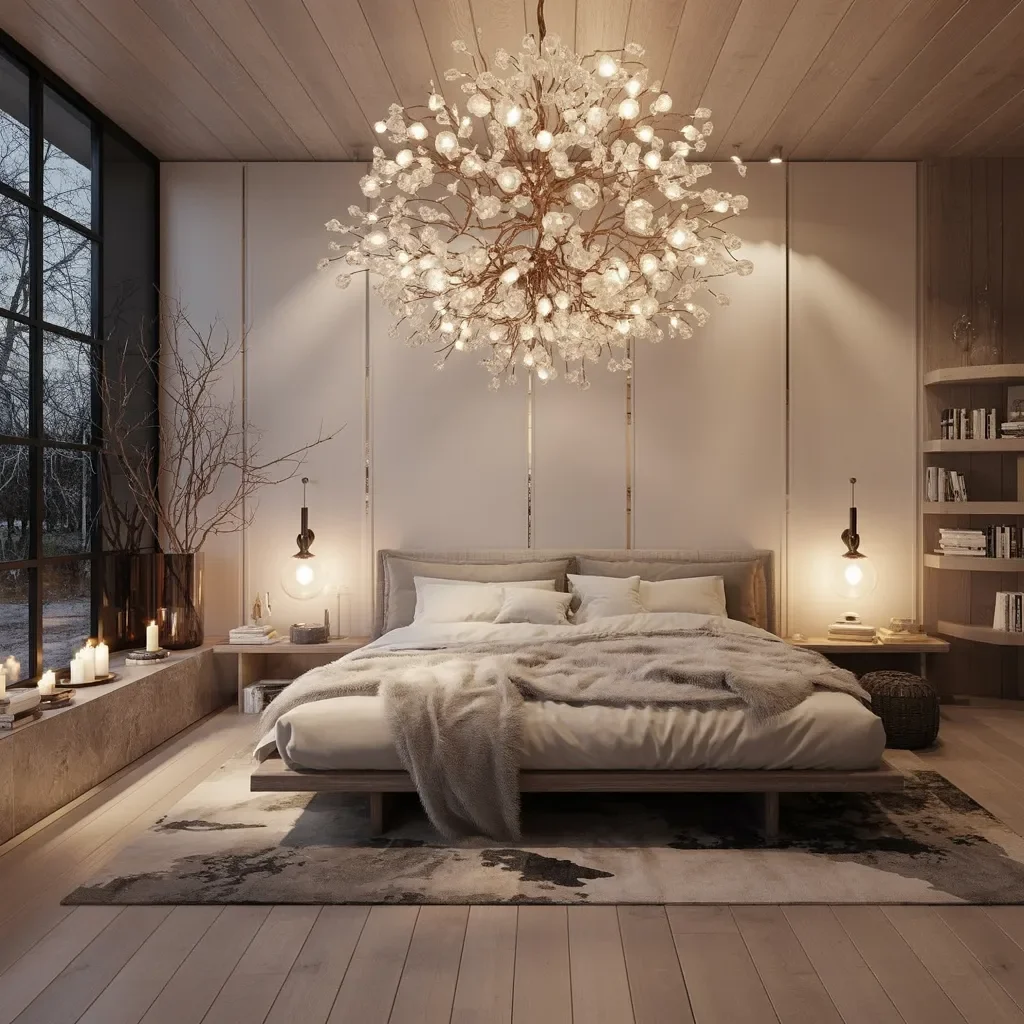 This ceiling design is highlighted by a captivating chandelier, resembling a cluster of glowing branches. The delicate, crystal-like bulbs scatter light throughout the room, creating a soft, ethereal glow that adds warmth and ambiance. Its intricate, nature-inspired design makes a bold yet refined statement in the bedroom.