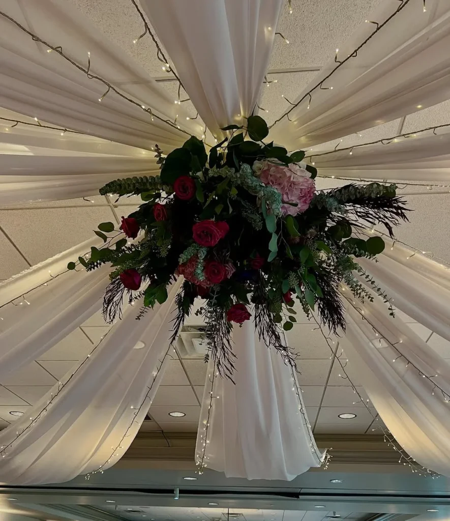 This ceiling design features a stunning floral arrangement suspended elegantly in the center. The soft white drapery is gathered in multiple points, creating a canopy effect that enhances the charm of the space. Delicate fairy lights are intertwined with the fabric, casting a warm, romantic glow across the room.