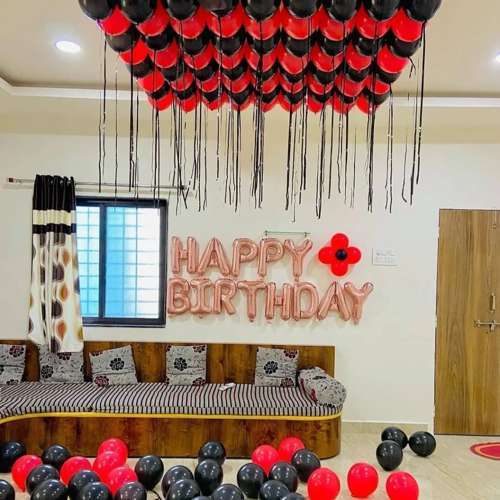 The bold contrast of red and black against the neutral background draws attention upward, while the “Happy Birthday” balloon lettering in shiny rose gold adds a cheerful message to the room. Below, scattered balloons complete the playful scene, giving the room a sense of fun and excitement.