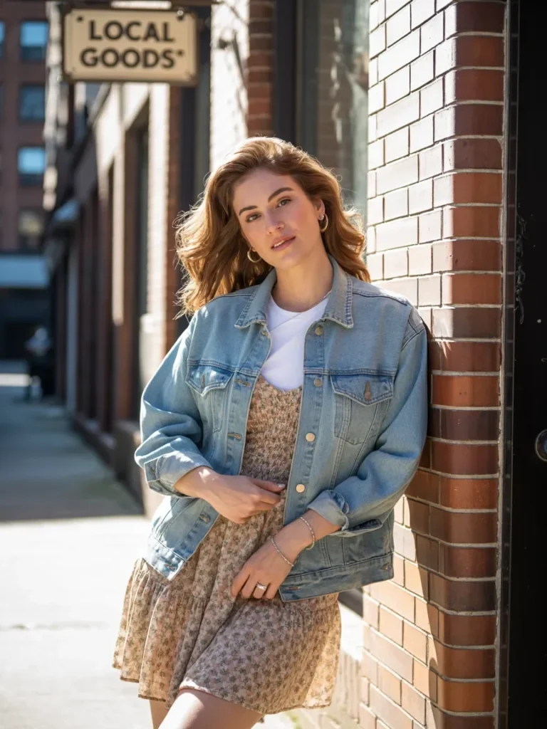 Soft sunlight and brick walls create a relaxed backdrop that matches this easy going concert outfit beautifully, making it feel natural and wearable. The floral mini dress brings softness and movement, while the denim jacket adds a casual layer that feels effortless rather than overstyled.