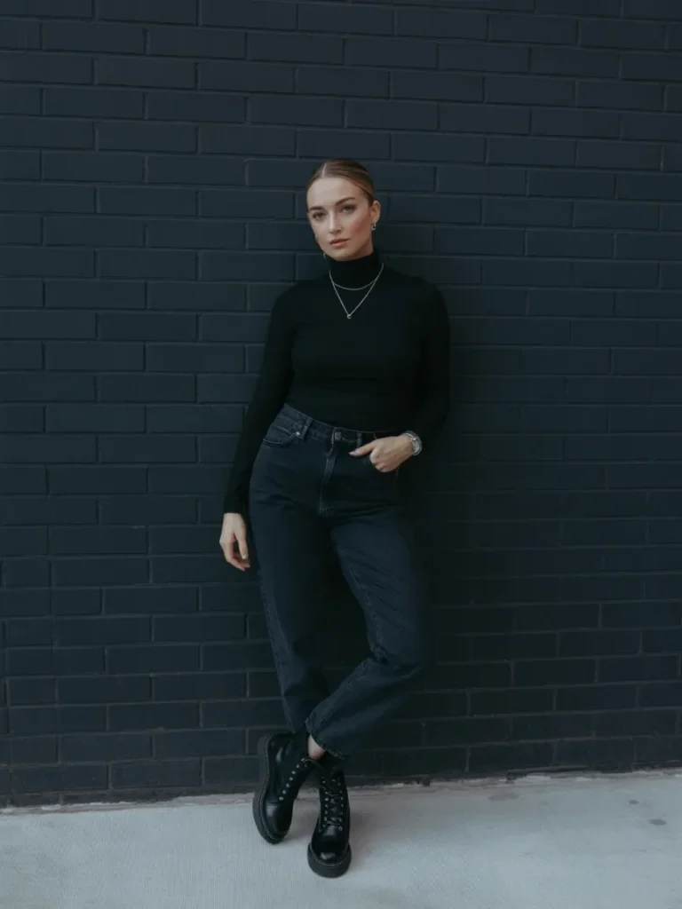 A sleek black fitted top instantly sets a confident tone, creating a clean silhouette that feels strong without trying too hard. Against a dark brick backdrop, the outfit carries a sharp city energy that works beautifully for evening concerts and indoor venues.