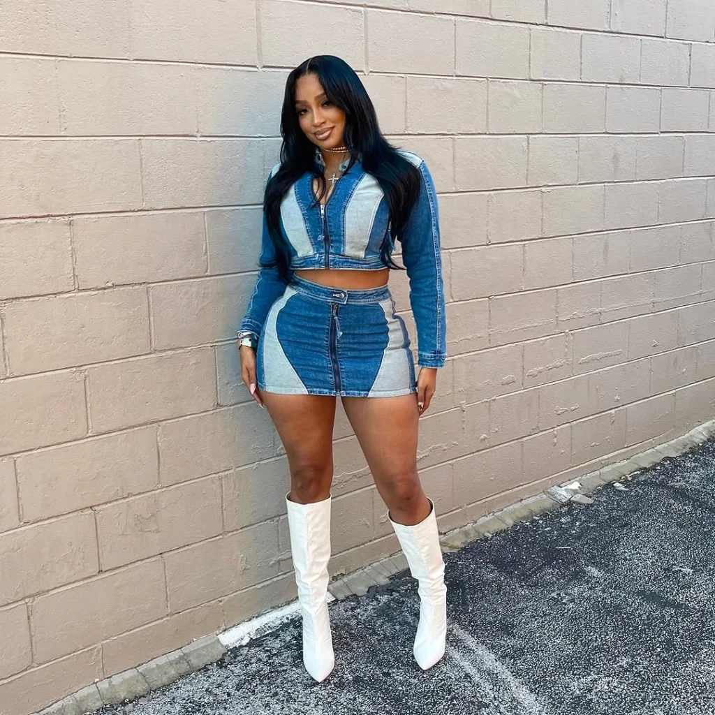 A structured denim crop jacket paired with a matching mini skirt creates a bold concert outfit that feels confident, modern, and easy to notice in a crowd. The two tone denim panels add shape and depth, giving the look a strong visual edge without feeling heavy or overworked.