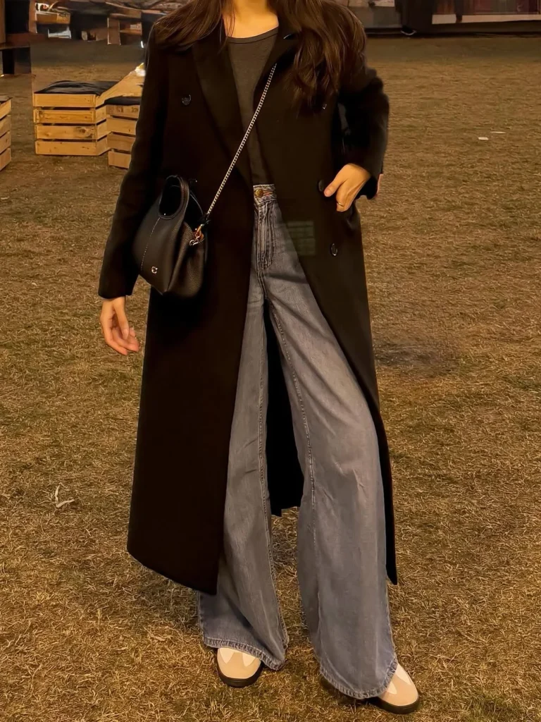 A long tailored coat instantly gives this concert outfit a confident and elevated feel while still keeping the look relaxed and wearable for long hours. Neutral layering underneath creates visual depth, helping the outfit stand out naturally under dim lights and crowded concert spaces.