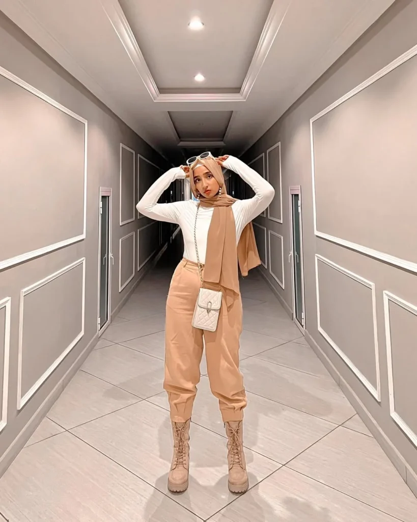Warm beige shades flow seamlessly from head to toe, creating a calm and confident look that feels intentional and modern. The matching hijab blends naturally into the outfit, adding elegance while keeping the overall style cohesive and balanced.