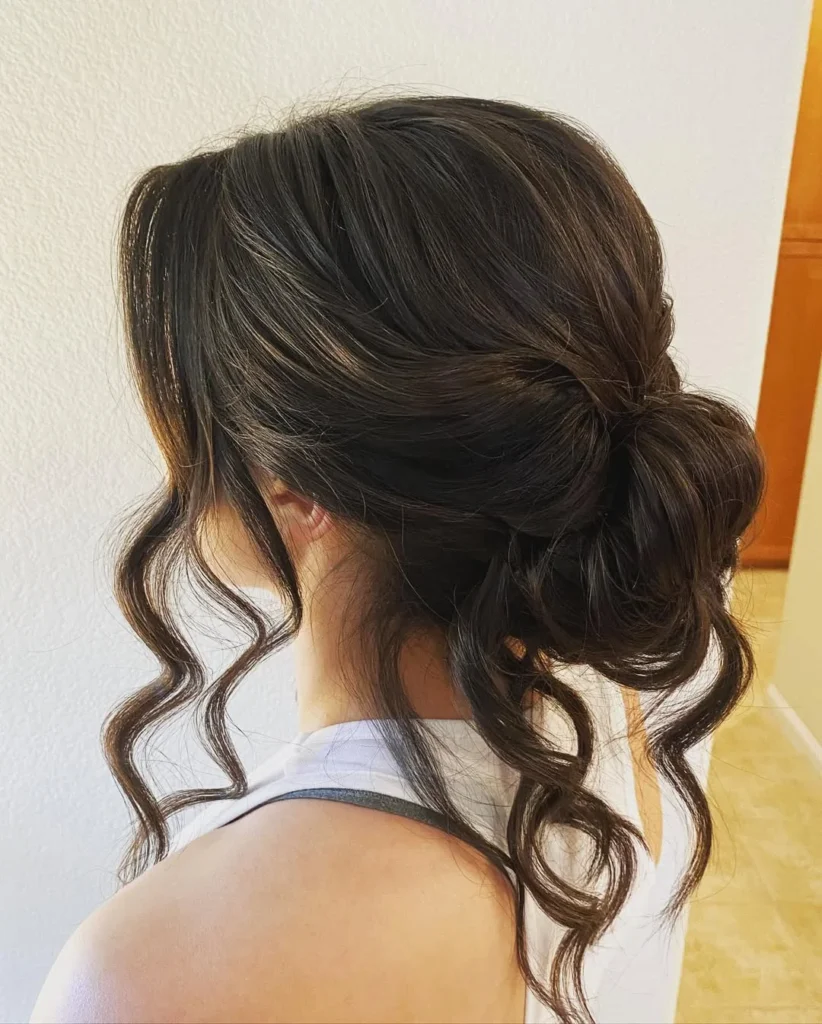 It’s a wonderful choice for weddings, dinner dates, or any moment that calls for understated elegance.To style, start with lightly curled hair to build natural movement. Gather it into a low bun, twisting sections loosely and pinning them for a textured finish.