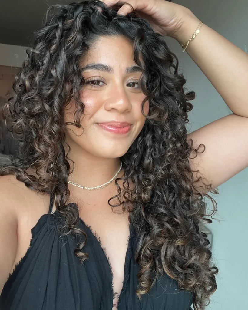 Once dry, fluff the roots gently with your fingers to create natural volume. The result is effortlessly beautiful hair that feels authentic and radiant, making it one of the most timeless and cute curly hairstyles for long hair.