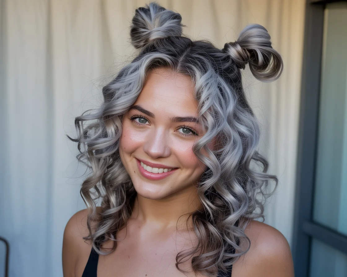 1. Playful Space Buns with Silver Curls