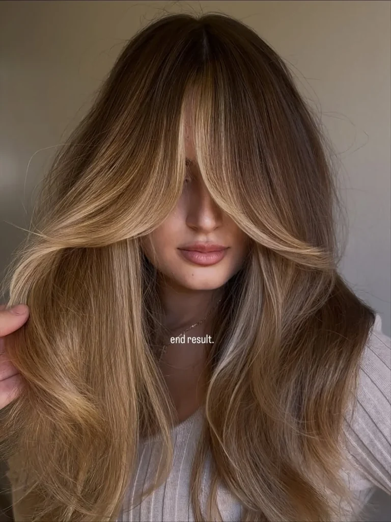This long layered hairstyle with curtain bangs adds instant movement and softness to your look. The gentle curls frame the face in a natural flow, giving a voluminous and effortless finish.