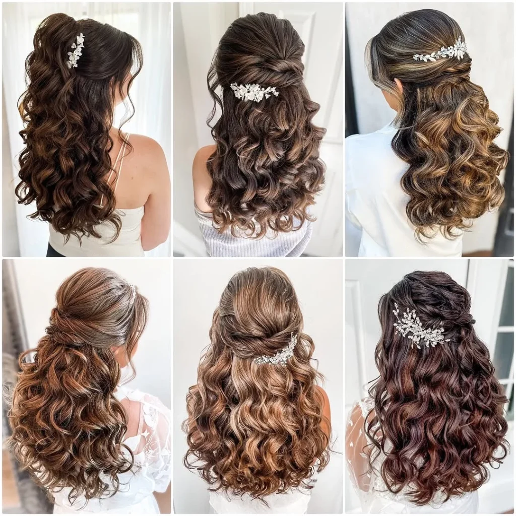 Soft curls meet timeless sophistication in these elegant half-up hairstyles.The flowing curls create natural volume, while the lifted crown adds graceful height that flatters any face shape.