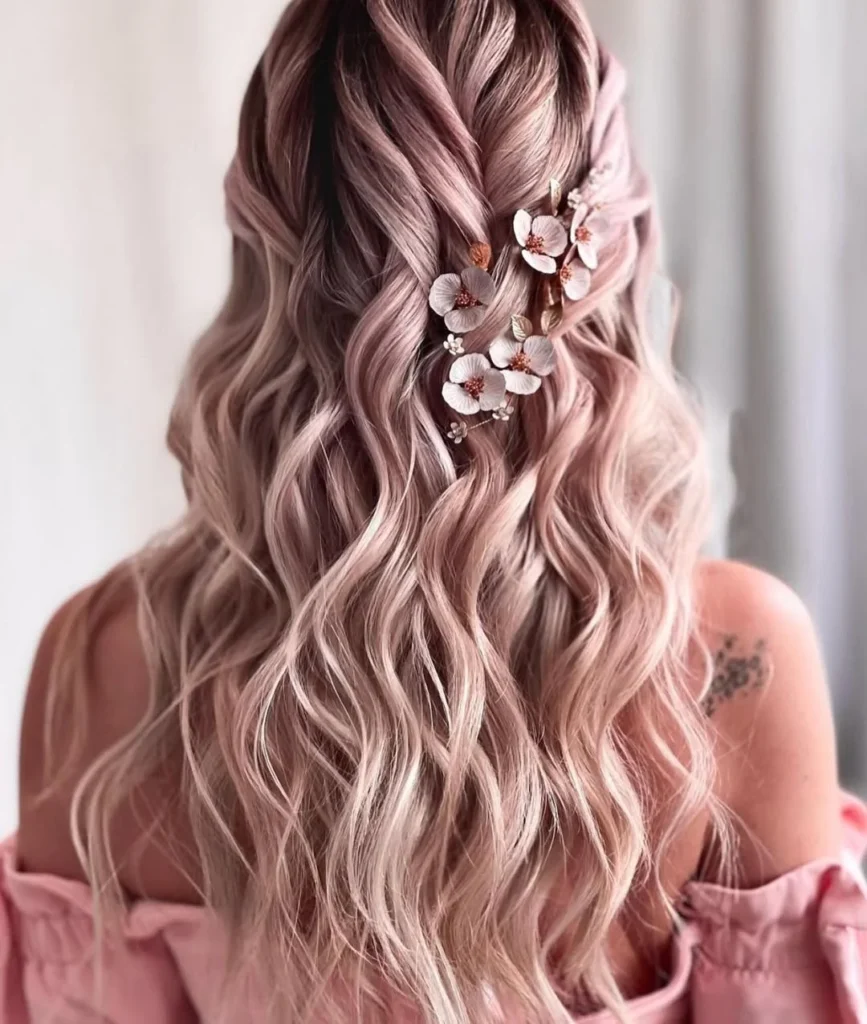Keep the waves relaxed for movement and volume. The pastel hue enhances the airy, fairytale feel, while the flowers add just the right touch of charm.This look pairs beautifully with off-shoulder dresses, soft makeup, and a radiant smile that completes the effortless, dreamy aesthetic.