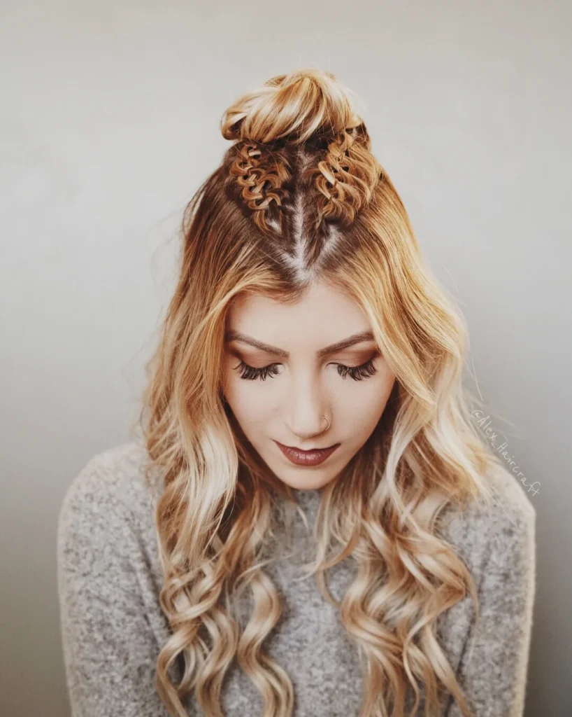 It’s a hairstyle that feels youthful yet polished, making it a favorite for music festivals, casual weekends, or days when you want something creative.Start by sectioning the top of your hair into three small parts and braid each one toward the crown.