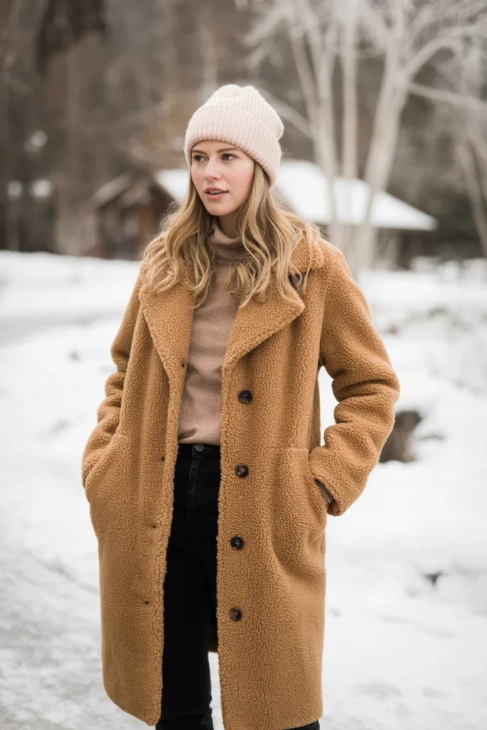 This winter outfit brings a warm, comforting feel that fits snowy days beautifully. A soft camel teddy coat adds texture and volume, giving the look a snug and relaxed tone.