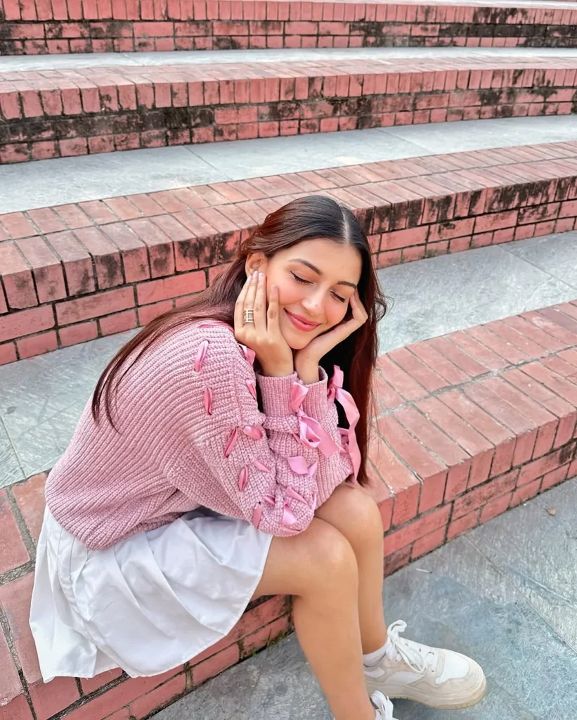 This outfit brings a sweet and gentle winter charm that feels warm and youthful. A pastel pink sweater with ribbon details along the sleeves adds a playful touch that stands out without feeling loud.