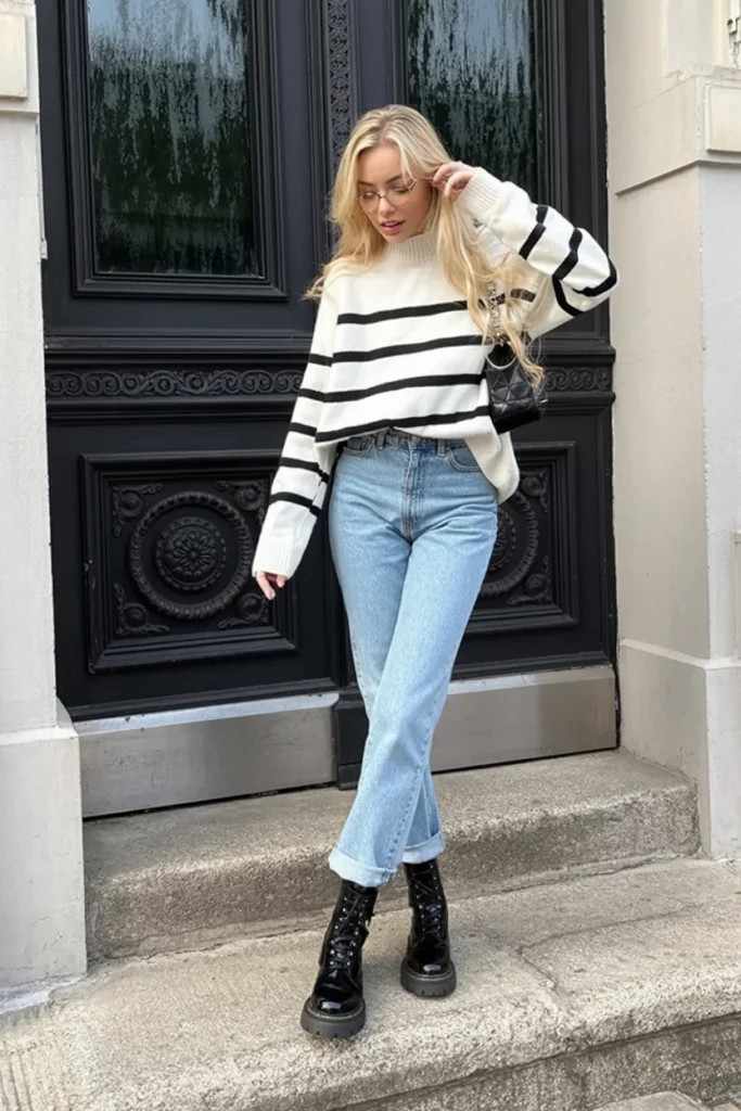 This winter outfit brings a clean and effortless charm that feels timeless. A soft white sweater with bold black stripes adds a simple yet stylish touch, creating a cozy layer that works well for chilly days.