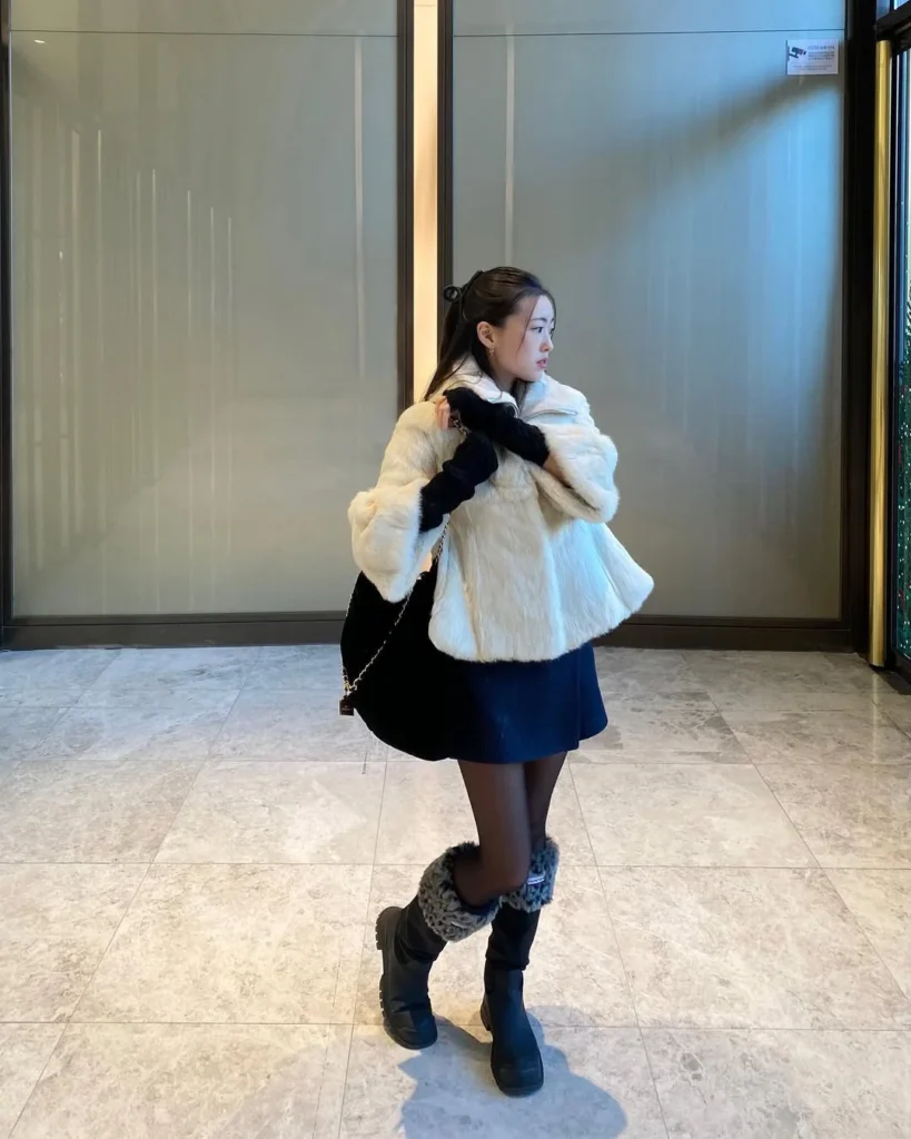 This outfit brings a warm, soft charm to winter days. A plush faux fur jacket adds a gentle volume that feels both cozy and stylish. Paired with a simple dark skirt and sheer tights, the look stays balanced without feeling heavy.