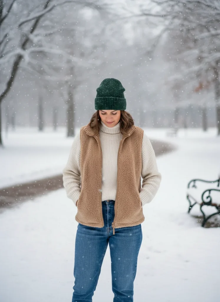 This winter outfit brings a warm and peaceful vibe that blends beautifully with snowy surroundings. A soft tan sherpa vest adds texture and comfort, creating a cozy outer layer that feels light yet snug.