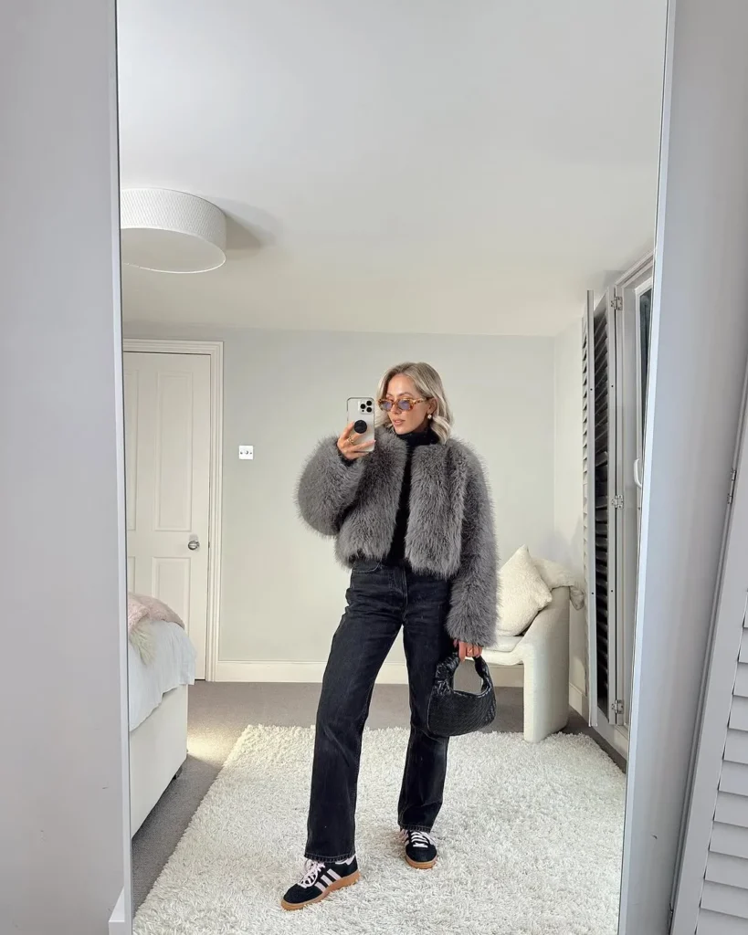 This winter look brings a clean and modern feel that suits chilly days effortlessly. A cropped grey faux fur jacket adds soft texture and volume, giving the outfit a cozy yet polished touch.