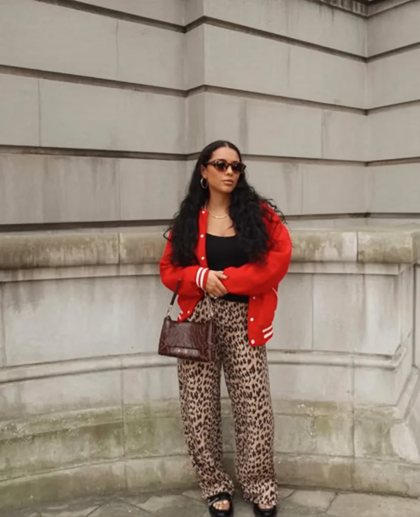 Her black top keeps things simple underneath, letting the jacket shine without competing for attention. The leopard-print pants add a fun, stylish twist that brings personality and motion to the outfit.