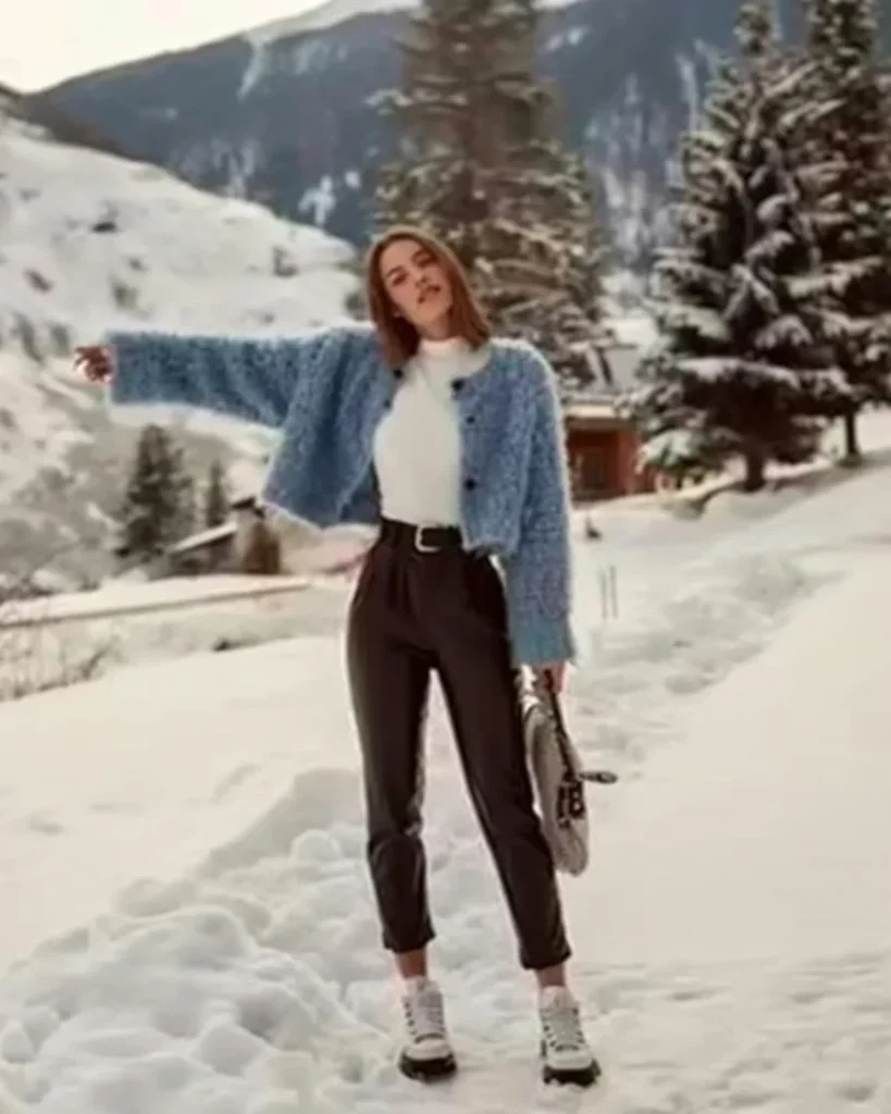 This winter outfit brings a fun and stylish vibe that fits snowy days beautifully. A cropped blue fuzzy jacket gives the look a soft, cozy texture that stands out against the bright snow.