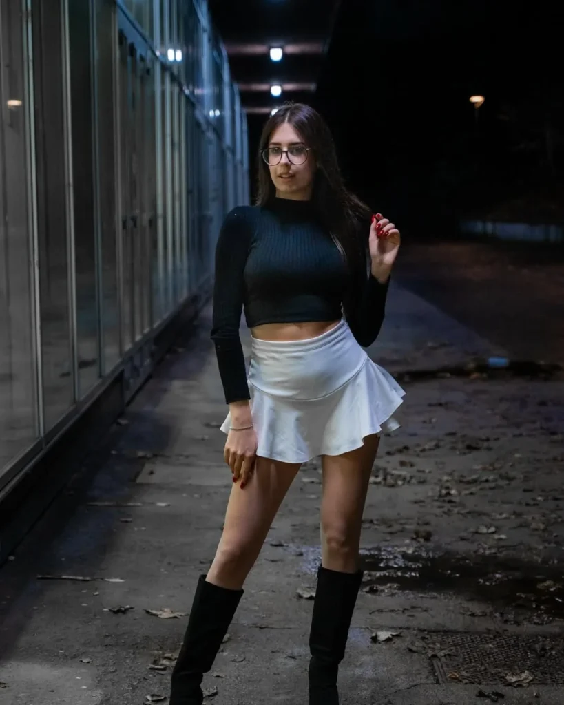 The mix of dark and light pieces creates a striking balance, especially under the cool evening lights. Her tall black boots give the outfit warmth and structure, making it feel ready for chilly nights out.