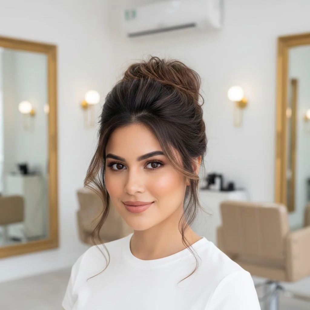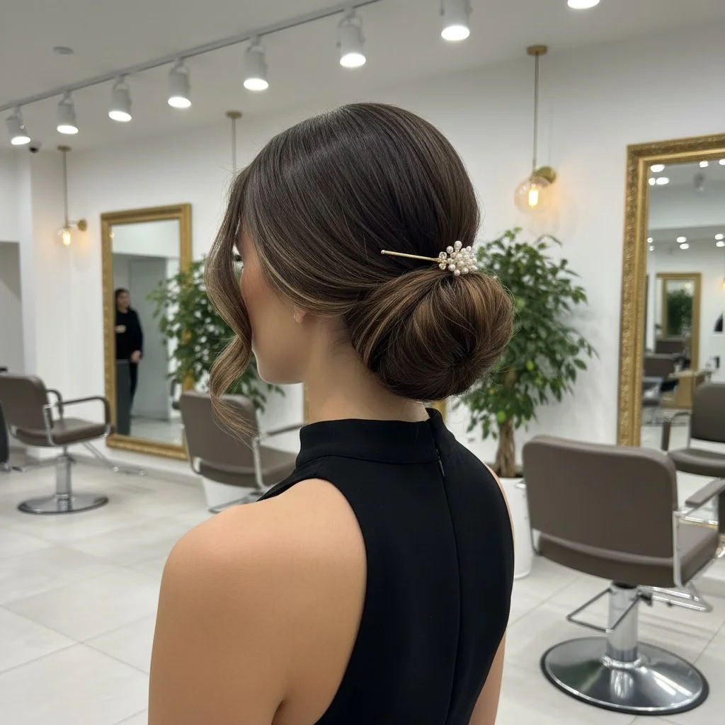 A low bun with soft, subtle highlights is a sleek yet sophisticated look. It’s perfect for evening events, and the light brown highlights add a touch of radiance against the darker brown. This style is simple yet elegant, and can be accessorized with a hairpin or floral detail for a more formal occasion.