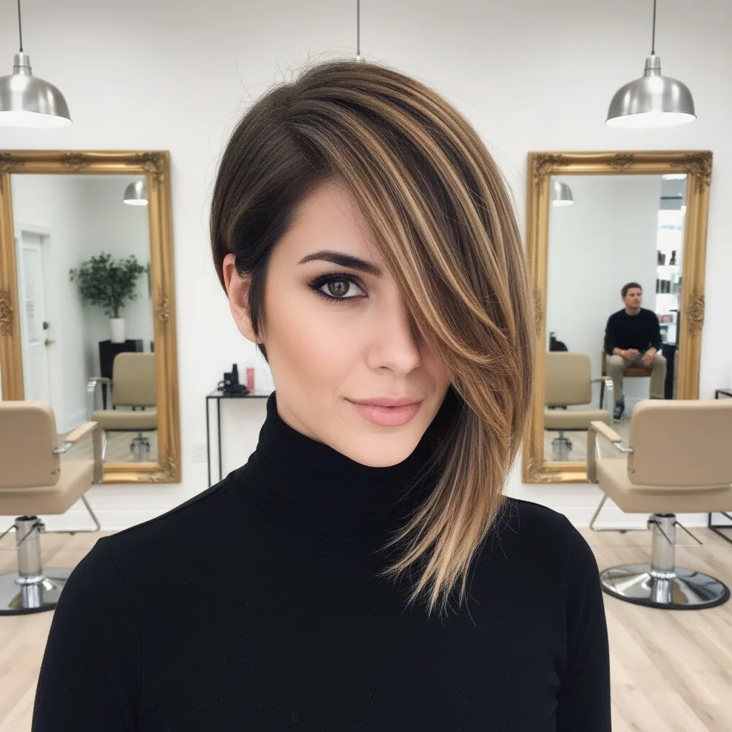 For a bold, edgy style, try an asymmetrical cut with light brown highlights. The sharp angles in your haircut will look even more dynamic when paired with the soft contrast of the highlights. This look is daring and unique, perfect for those who like to stand out.