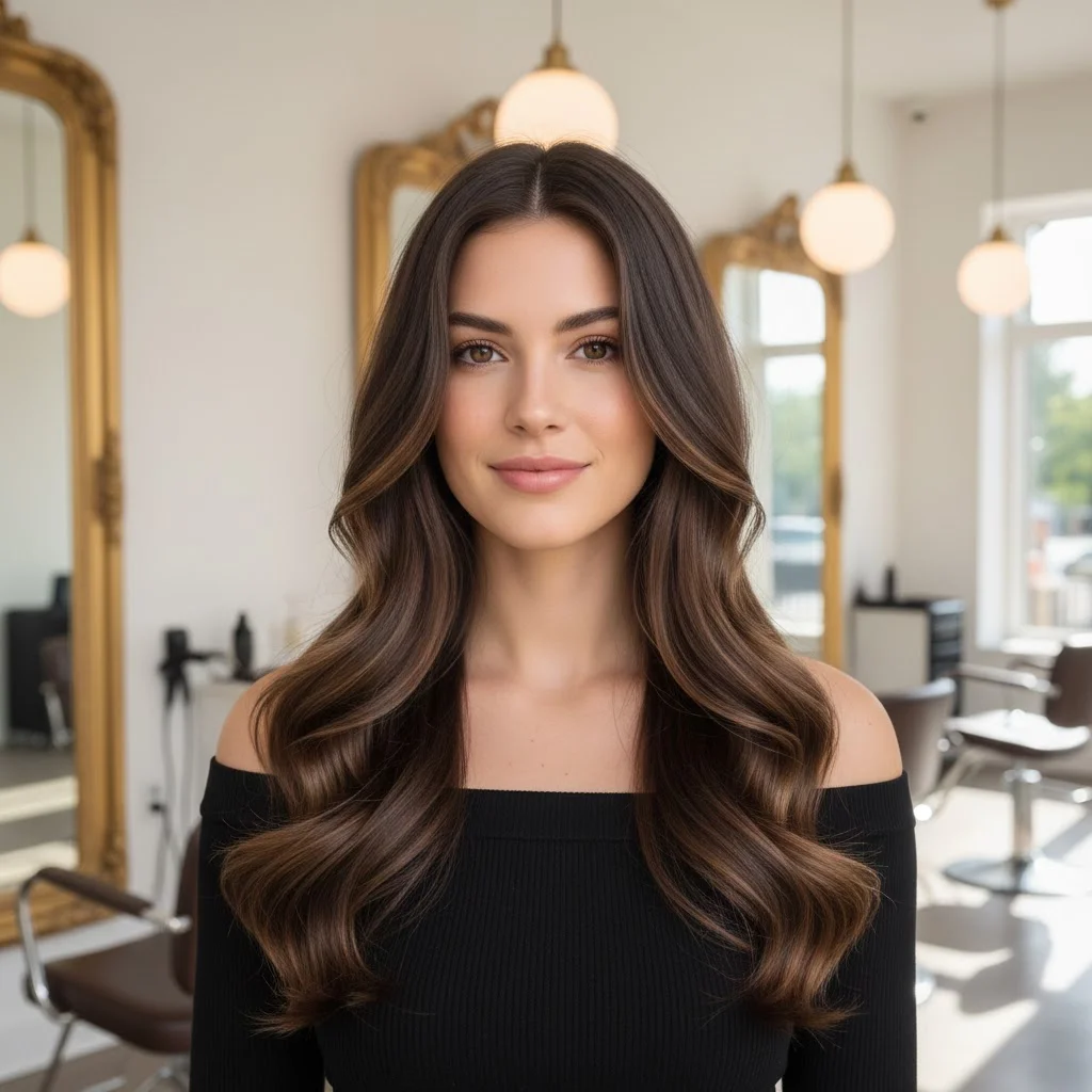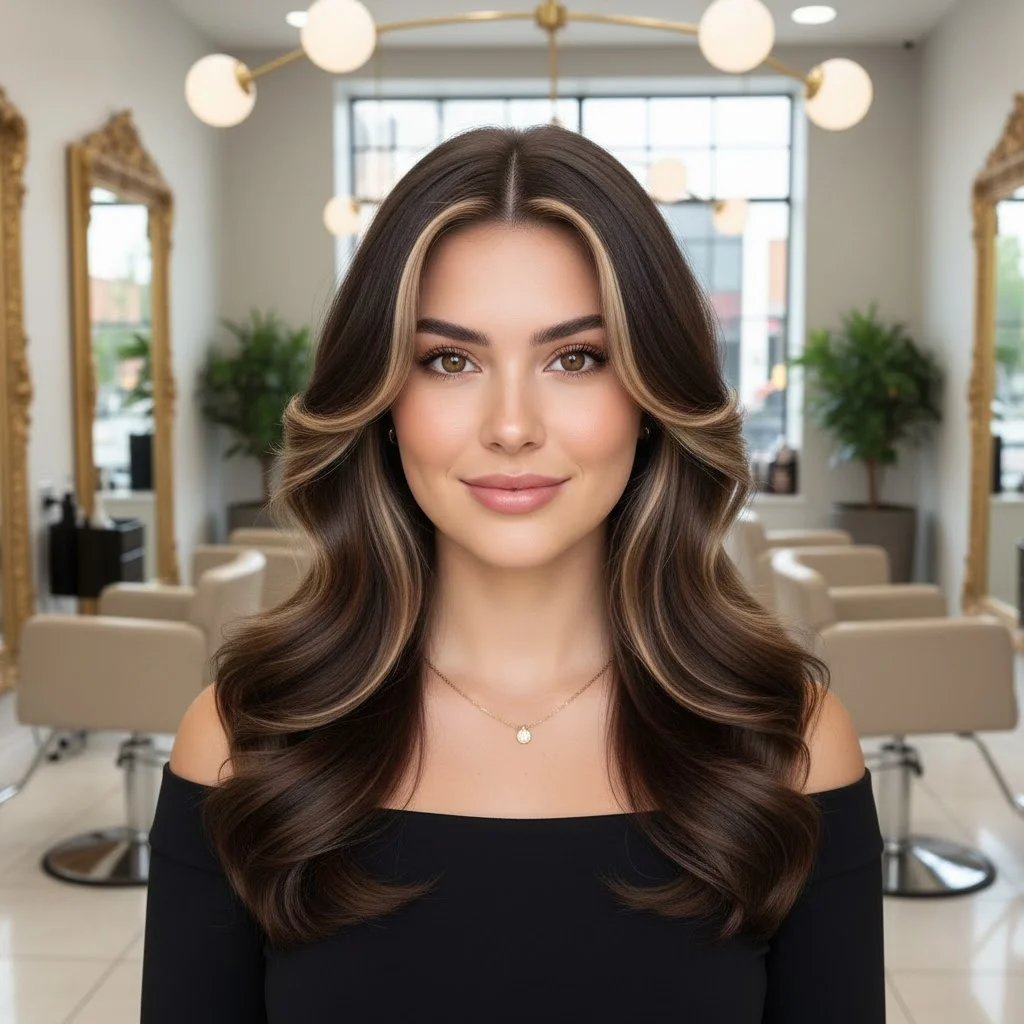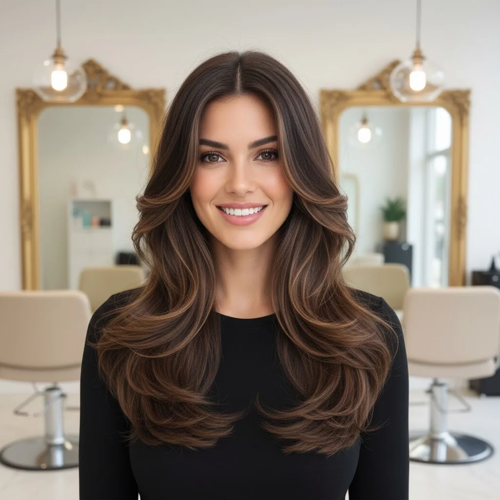 Add some long layers to your dark brown hair, and incorporate light brown highlights throughout the layers. This adds movement and dimension to your hair, creating a soft, cascading effect. The highlights are subtle enough to blend in, but they’ll catch the light beautifully, giving your hair a luminous quality.