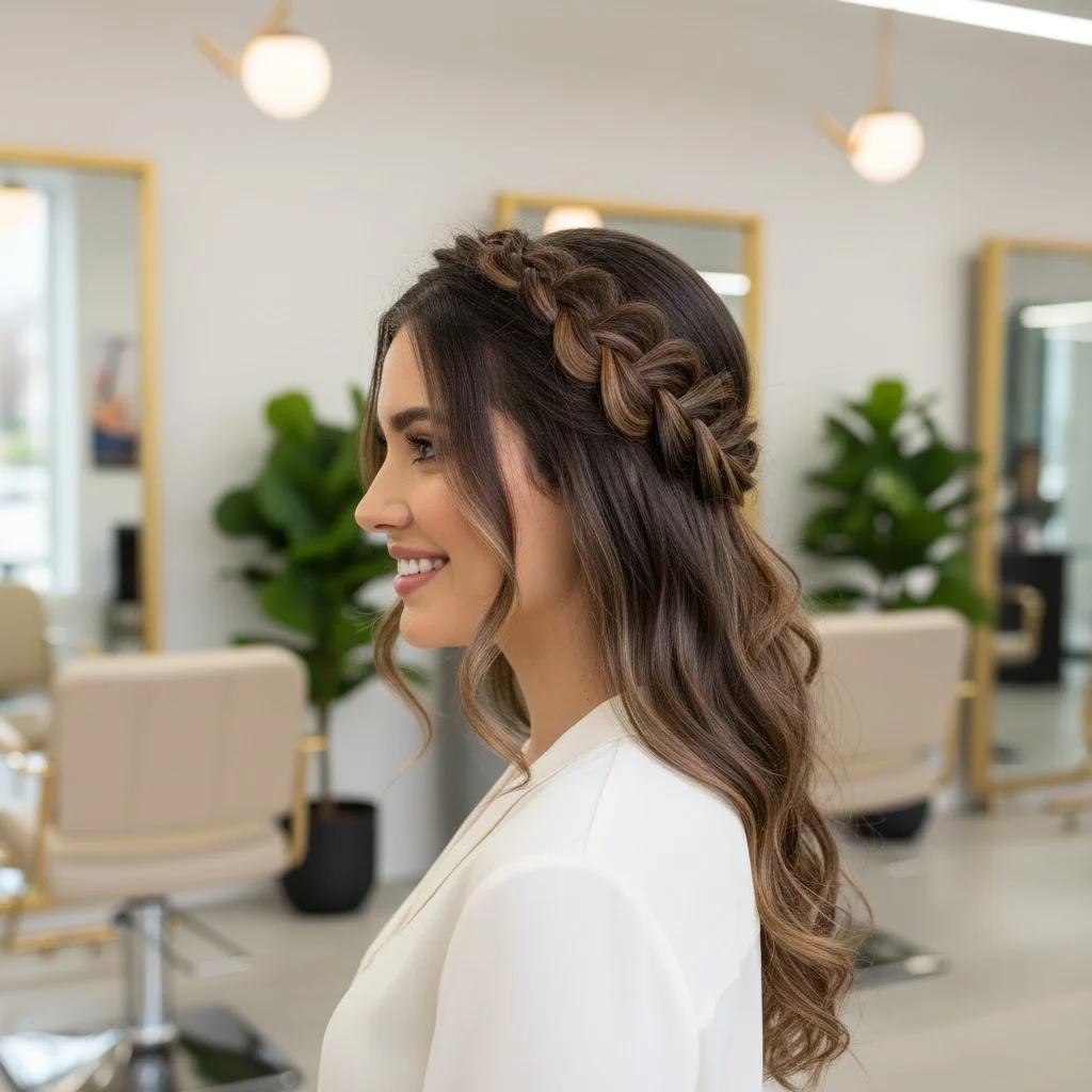 For something more romantic, try a braided crown with your dark brown hair. The braids, combined with light brown highlights, will add texture and dimension, creating a soft, elegant look perfect for weddings, parties, or any special event.